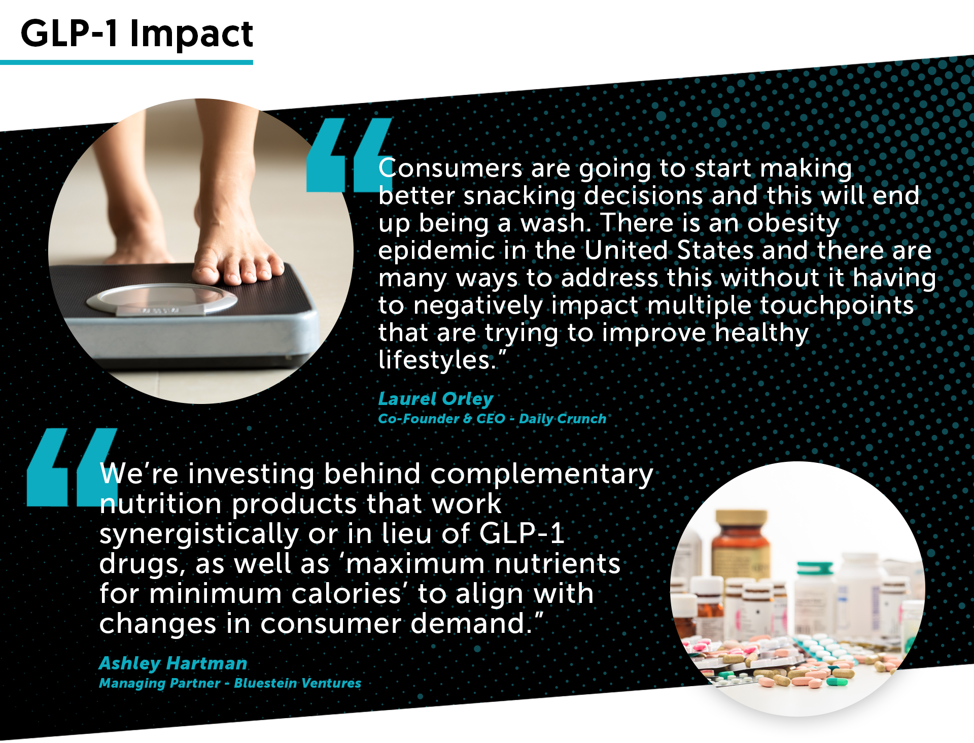 “The growth of GLP-1s is influencing our investment strategy. The explosion in GLP-1 usage for weight loss and diabetes is a paradigm shift that will reshape food and health. We’re investing behind complementary nutrition products that work synergistically or in lieu of GLP-1 drugs, as well as ‘maximum nutrients for minimum calories’ to align with changes in consumer demand.” – Ashley Hartman, Managing Partner, Bluestein Ventures