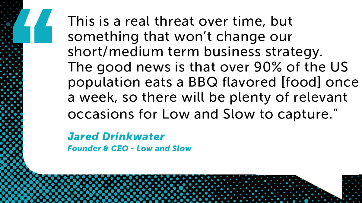 “This is a real threat over time, but something that won’t change our short/medium-term business strategy. The good news is that over 90% of the U.S. population eats a BBQ flavored [food] once a week, so there will be plenty of relevant occasions for Low and Slow to capture.” – Jared Drinkwater, founder/CEO, Low and Slow