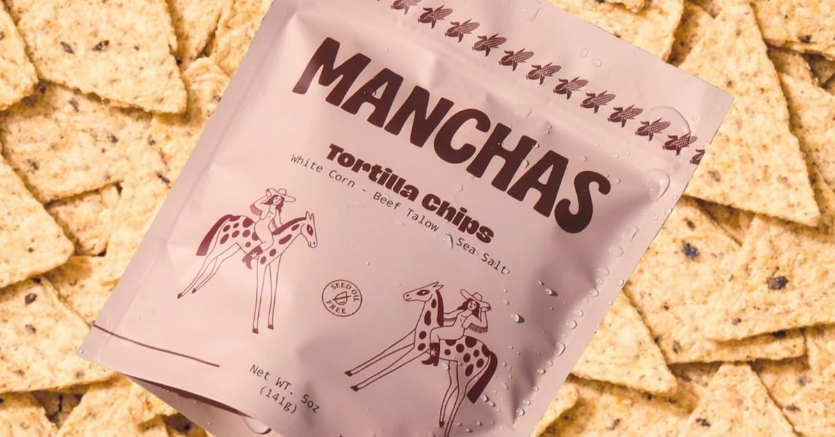 Manchas Tortilla Chips are positioned as a premium, traditionally made take on a pantry staple, leaning heavily into ingredient integrity and process. Produced in Mexico using stone-ground, nixtamalized white corn, the chips are cooked in grass-fed beef tallow and finished with sea salt, resulting in a product with just three ingredients. The minimalist beige packaging reinforces the brand’s artisanal intent, with simple typography and whimsical illustrations that stand out quietly on shelf rather than shouting for attention.