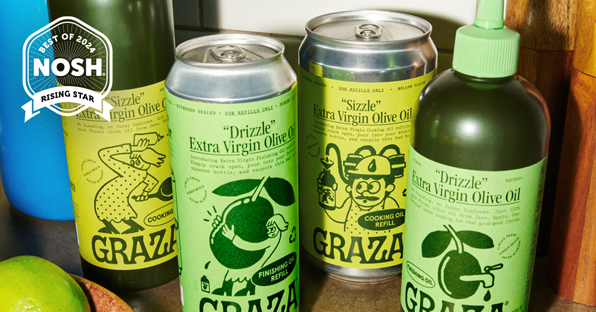 Enter Graza, which is injecting whimsy and innovation into the segment with its bright, playfully-branded squeeze bottles offered in two varieties: “Sizzle” Cooking Oil and “Drizzle” Finishing Oil. This year, the brand took its clever packaging designs one step further by launching beer can-style refills for both varieties, blurring the lines between utility, sustainability and aesthetics.