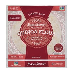 - Quinoa Flour Certified Gluten Free Tortilla is made with a unique blend of quinoa flour, tapioca and potato starch, combined with avocado oil. It’s free of dairy, wheat, soy and egg, only 100 calories, and is Vegan and Kosher certified. There are six tortillas per package and retails for approximately $4.29 at Whole Foods.
