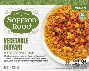 The four new Saffron Road frozen meals are launching this month at the upcoming Specialty Food Association’s Summer Fancy Food Show in New York City, booth 5840. Here, the Vegetable Biryani will be available for sampling along with their popular new Ramen Bowls and Crunchy Chickpea snack products.