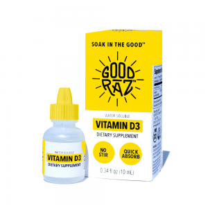 Good Raz (pronounced “Good Rays”) water-soluble Vitamin D3 Drops are a one-of-a-kind, quick absorbing, taste-free supplement that can be easily added to your favorite foods and beverages. Just add two drops of take-anywhere, add-to-anything, taste-nothing, Good Raz in your morning coffee, water, tea, cereal, or yogurt for 2,000 IU vitamin D3 to help support immune health, a positive mood, bone and heart health, and more.*