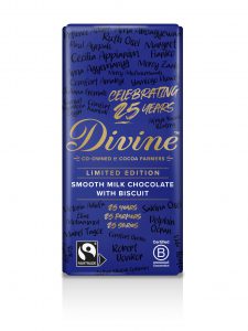 WASHINGTON, D.C.— To celebrate its 25th Anniversary, Divine Chocolate – the world’s first and only farmer-owned, Fairtrade, B-Corp certified premium chocolate brand – is launching a limited edition Birthday Bar with packaging that showcases the names and stories of 25 cocoa farmers. This special Birthday Bar features buttery biscuit pieces covered in Divine’s signature smooth milk chocolate.
