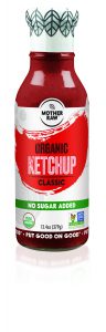 - Mother Raw Organic Ketchups tick all the boxes and are made for dunking and dousing. Containing only 1 gram of sugar per serving, no added sugar, and less than half the sodium of the leading brand, these Organic Ketchups are bursting with the goodness of vine-ripened tomatoes and the natural sweetness of dates. Mother Raw’s Organic Ketchups are available in Classic and Spicy. The Classic delivers the taste consumers expect, while the Spicy variety is for those who prefer a kick of heat that builds nicely with each bite.