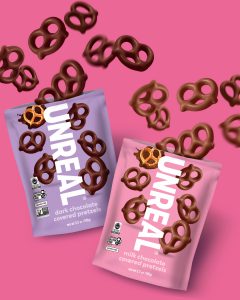 “You know that snack you eat on your drive home from the store? That’s our almonds and pretzels,” says Ann Bumpus, UNREAL Brand Director. “We’re really excited for consumers to have real-ingredient options in that sweet spot between a snack and treat.”