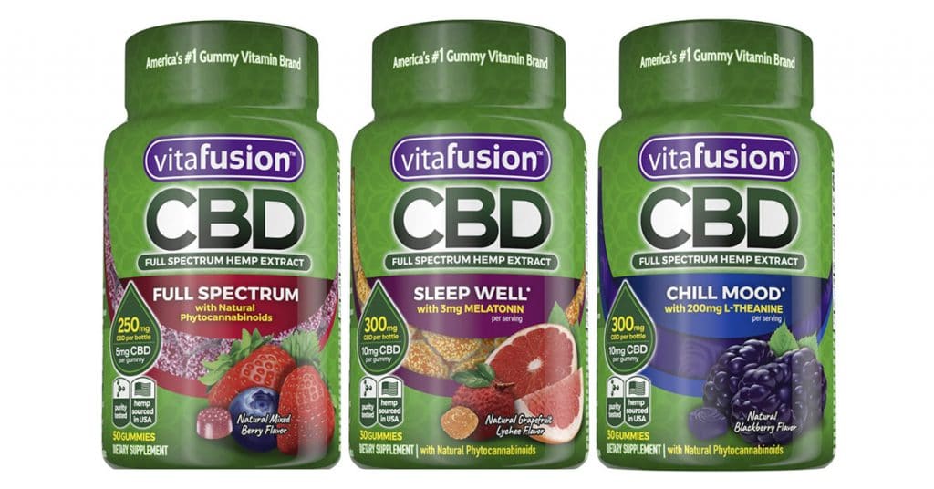 Vitamin brand Vitafusion has added a new CBD product line to its portfolio of gummy vitamins for adults. The line uses full spectrum hemp and is available in three varieties -- a 5 mg CBD gummy and in 10 mg Sleep Well and Chill Mood gummies -- online and at select retailers for a suggested retail price of $29.99.