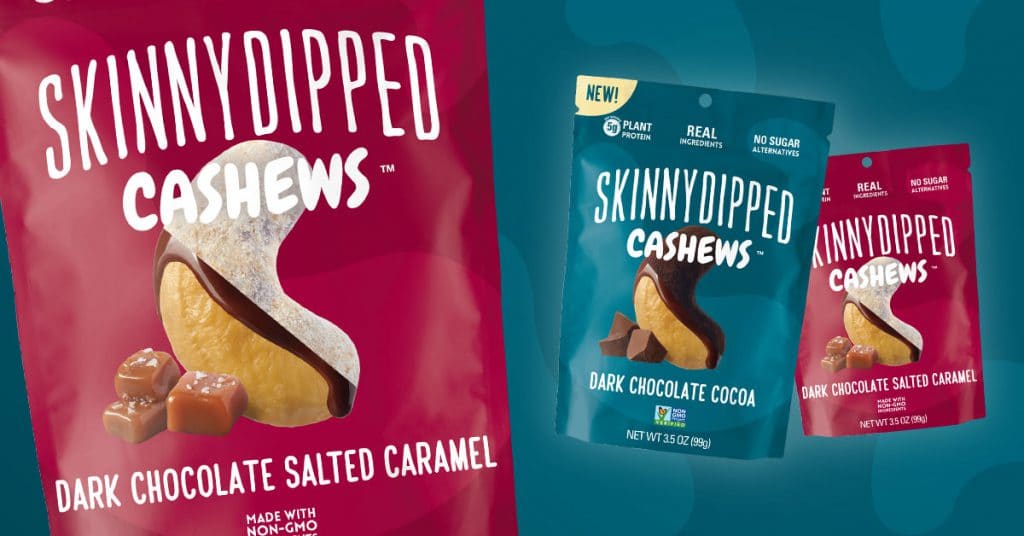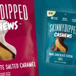 Sweet-dipped nut brand SkinnyDipped will launch Chocolate Dipped Cashews in Dark Chocolate Cocoa and Dark Chocolate Salted Caramel, its first portfolio expansion beyond almonds. The brand is marketing the product, which carries a $4.99 MSRP, as a fiber rich, protein-enhanced, low-sugar product.