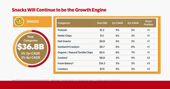 An integral part of that turnaround plan was accelerating the growth of its snack brands and stabilizing its Meal & Beverage business, which the company said have increased 5% and 6%, respectively, on a two-year CAGR basis.