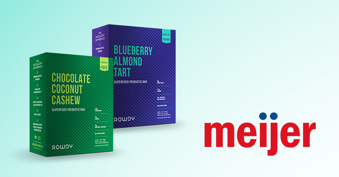 Nutrition bar maker Rowdy announced that supermarket chain Meijer has introduced two flavors of its prebiotic, Yacon Root-based line of nutrition bars to all 259 stores across the Midwest. Chocolate Coconut Cashew and Blueberry Almond Tart contain collagen protein and up to 9 grams of fiber per bar. The two flavors are now available in 4-count packs for $9.99.