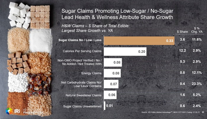 Among health and wellness related tenets, low or no sugar claims played a key role indicating that consumers are looking to tone down sugar consumption without entirely forgoing indulgent occasions, the report states. This spurred 12% dollar sales growth, for both food and beverage brands that prioritized sugar claims. Brands that honed in on the no or low sugar callout saw dollar sales outpace the growth of products with other health related claims, according to the report, including callouts for unsweetened or natural sweeteners, calorie per serving statements and low to no net carbs.