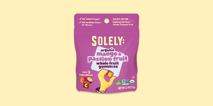 Solely’s mission is to bring organic fruit snacks to kids with the benefits of no added sugar and a nutritious boost of Vitamin C. The company is expanding its popular Whole Fruit Gummies line with a new flavor, Mango Passionfruit, in new 2.5 oz, travel-friendly pouches that CEO Simon Sacal will “make Solely a staple in drugstores, travel, airport retail locations, roadside convenience stores, vending and more micro-markets.”