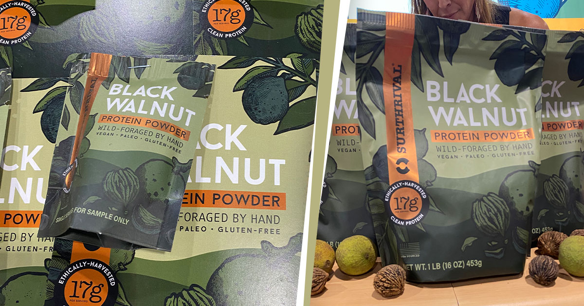 That’s the concept behind Vitalis’ extension of his personal brand, Surthrival (#4176), into the food industry after making its premiere at Expo East with a single product: Black Walnut Protein Powder. There are currently 306 million black walnut trees growing in the U.S., Vitalis explained, and all of them are wild, meaning none of these trees have been grown for agricultural use. Black walnuts contain a significant amount of protein – 17 grams per each scoop of Surthrival’s powder – but have not been used distinctly for this purpose in the CPG space until now.