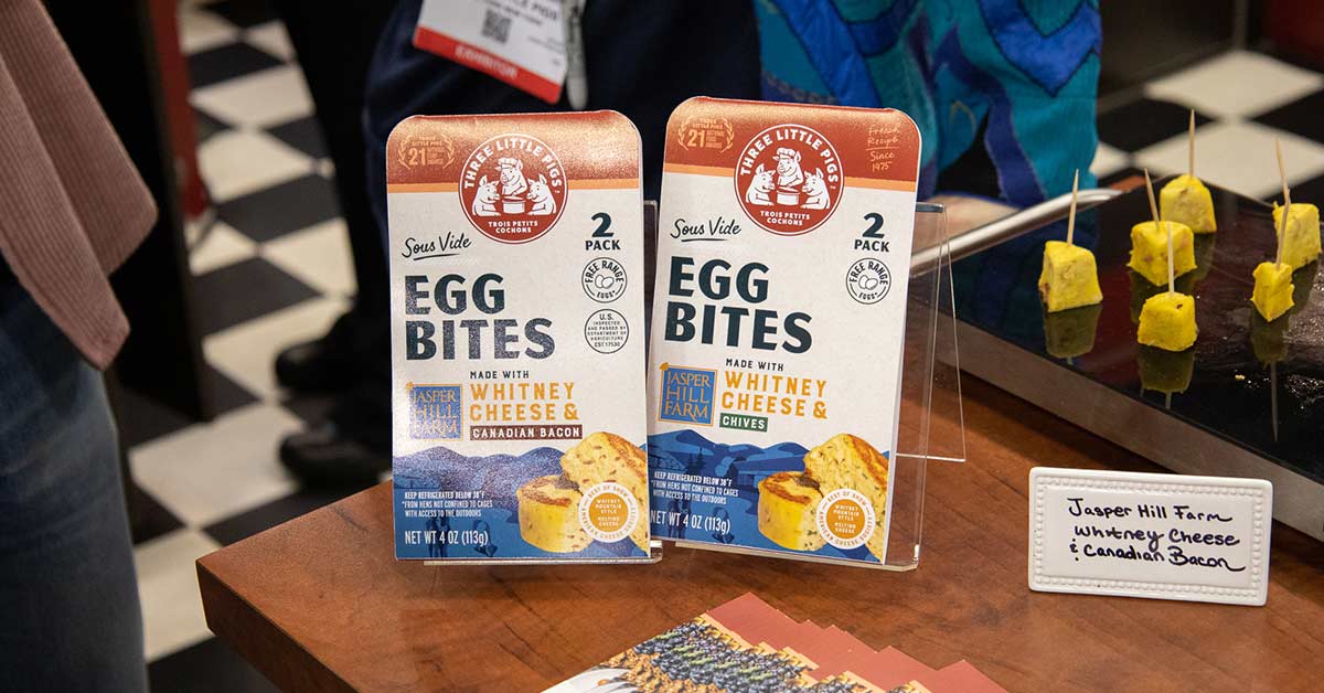 Charcuterie maker Three Little Pigs (Trois Petits Cochons) sampled the brand’s two new sous vide Egg Bites. The 4-ounce, two-packs of grab-and-go egg cups come in Canadian Bacon and Chive using Jasper Hill Farm Whitney cheese and free-range eggs. The microwaveable breakfast items extend Three Little Pigs’ line of Egg Bites that already feature Spinach and Feta as well as Ham, Cheddar And Chili Pepper varieties.