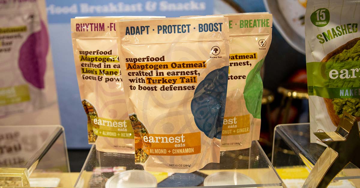 San Diego, California-based Earnest Eats showed off its new versions of its regenerative oatmeal featuring adaptogenic mushrooms like lion’s mane and turkey tail. The new oatmeals come in 10 oz. bags in three flavors: Almond + Hemp, Almond + Cinnamon, and Coconut + Ginger. Earnest Eats also makes almond butter bars, superfood-enriched oatmeal cups and snacking avocado bags.