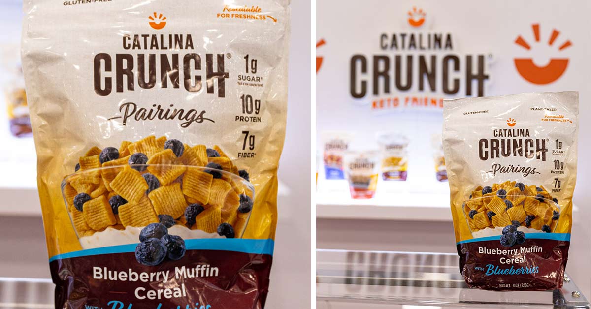 Keto-friendly snack brand Catalina Crunch was sampling its gluten-free, plant-based Pairings Blueberry Muffin Cereal at Expo West last week. The new cereal flavor comes in 8 oz. bags and features 10g of protein, 7g of fiber and only 1g of sugar. The product rounds out the brand’s portfolio of high-protein, low-sugar cereals, snack Crunch Mixes and sandwich cookies.
