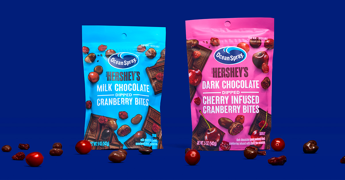 “We are excited by this partnership and extension of our iconic Hershey’s brand into new snacking occasions,” said Hershey Licensing Company president Ernie Savo in a statement. “Ocean Spray is synonymous with cranberry, and we can’t think of [a] better way to enjoy this wonderful superfruit than with an indulgent touch of delicious Hershey’s milk chocolate.”