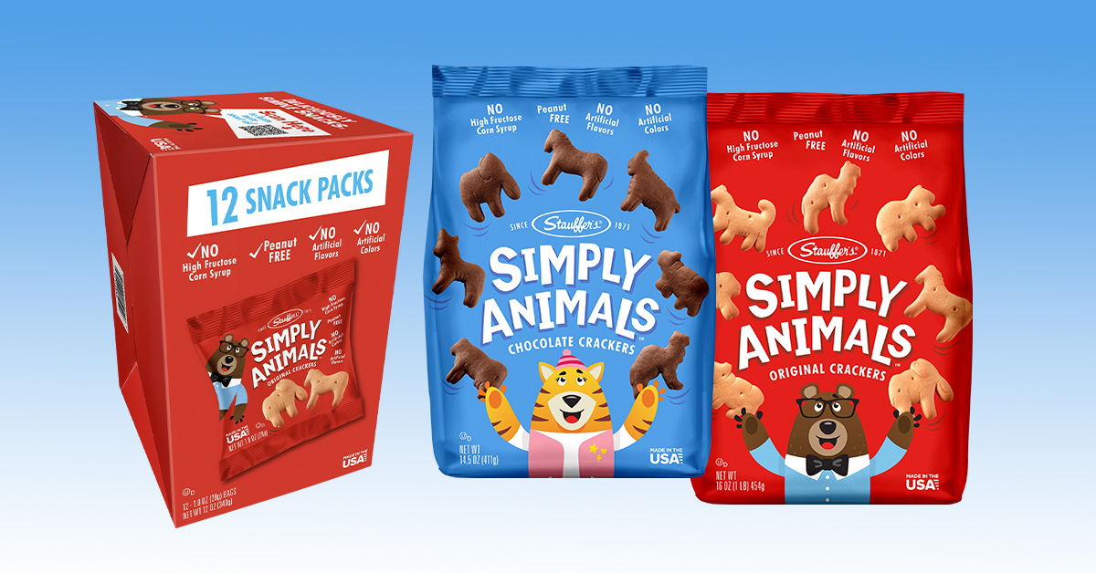 Stauffer’s has announced the pre-launch of Simply Animals, a better-for-you modern spin on its beloved animal crackers. Offered in two flavors – Original and Chocolate – the updated ingredient formula contains no high fructose corn syrup, no artificial colors or flavors and is peanut-free. For the market test, set to take place in-store at Food City and Weis Markets in January, the Original flavor will be available in a 16 oz. bag and 12-bag single-serve multipack while the Chocolate flavor will be available in a 14.5 oz. bag.