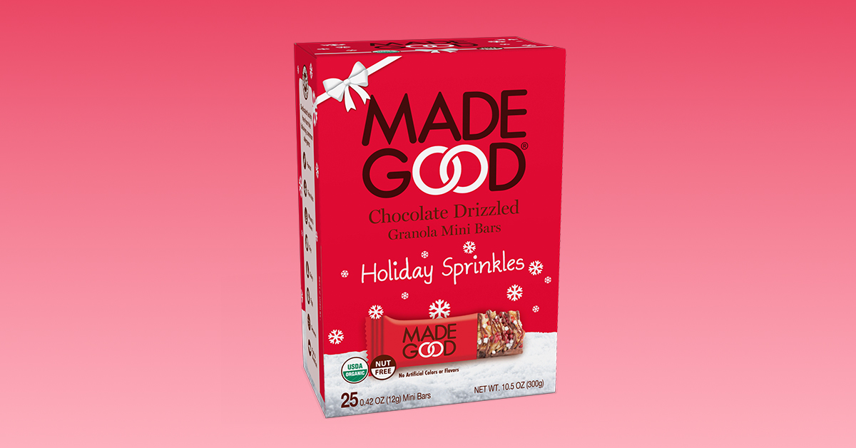 MadeGood has expanded its portfolio of allergy-friendly granola bars with the launch of Holiday Sprinkles Drizzled Granola Mini Bars. The better-for-you indulgent treats are gluten-free, vegan and free of the top eight most common allergens. MadeGood’s Holiday Sprinkles Drizzled Granola Mini Bars are available at retailers nationwide including Kroger, Albertsons, Sprouts and Wegmans for a SRP of $9 per 25-count box.