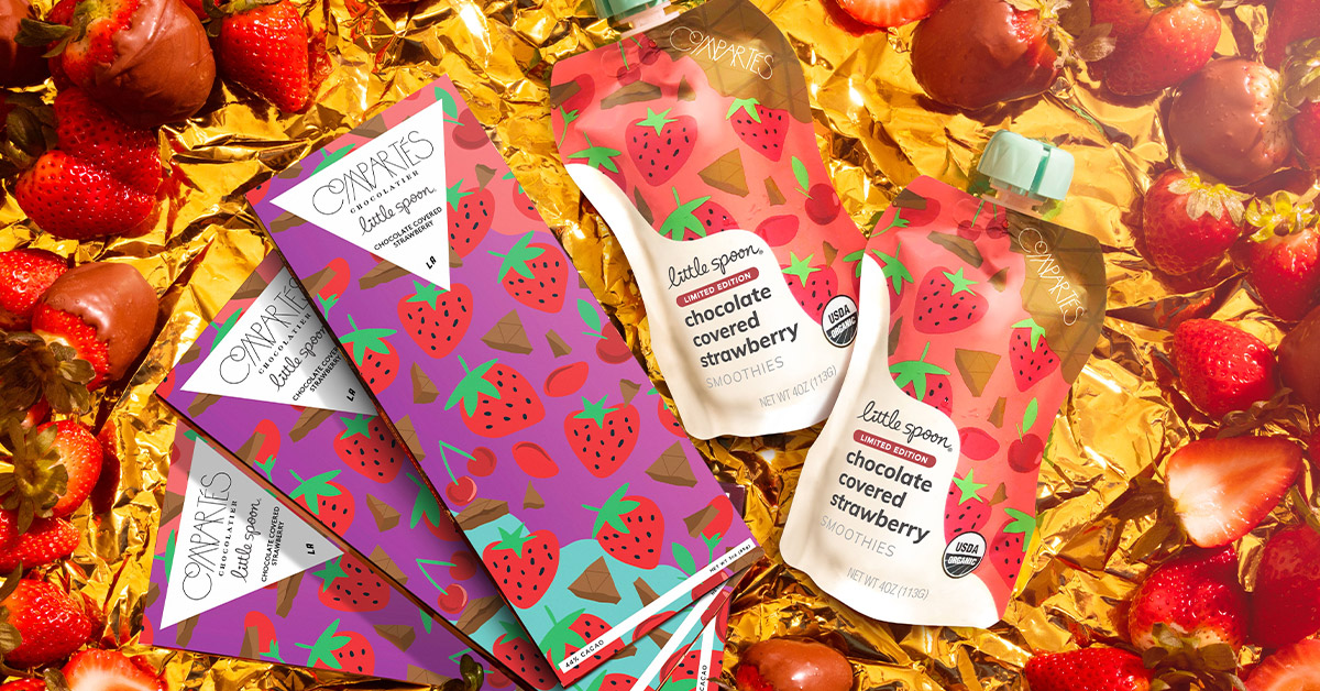 In anticipation of Valentine’s Day, organic baby food maker Little Spoon teamed up with premium chocolate brand Compartés to launch two new products: Chocolate Covered Strawberry Smoothies and Chocolate Covered Strawberries Chocolate Bars. The former, formulated for kids with three grams of protein per pouch, features ingredients such as Muraski sweet potato, fair trade cocoa, and strawberries.The latter, crafted for adults, is a dark chocolate bar with dried strawberries. Both new products are exclusively available on Little Spoon’s website.