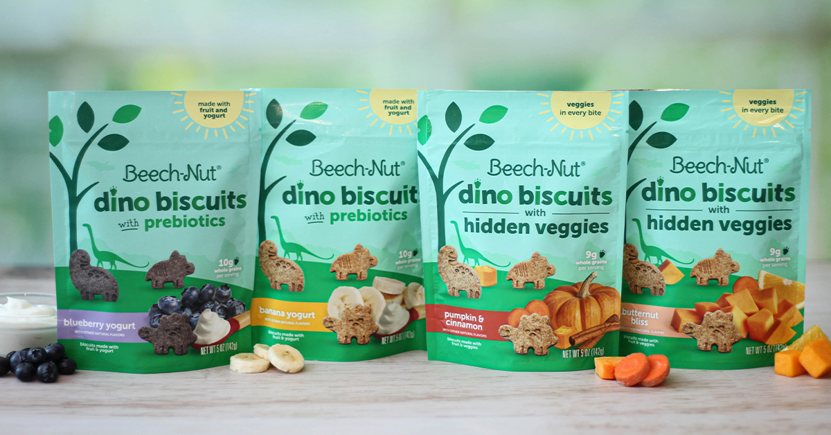 Baby and toddler food manufacturer Beech-Nut Nutrition Company released new Dino Biscuits with Hidden Veggies and Dino Biscuits with Prebiotics. The former is available in Pumpkin & Cinnamon and Butternut Bliss flavors while the latter is available in Banana Yogurt and Blueberry Yogurt varieties. Intended for children ages 12 months and older, the biscuits come in 5 oz. resealable bags and are available at Walmart stores nationwide.
