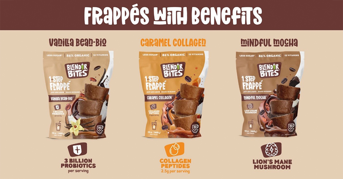 Pre-portioned functional food brand Blender Bites has announced its newest innovation, 1-Step Frappé. Available in three flavors at launch – Vanilla Bean Bio, Caramel Collagen and Mindful Mocha – each serving boasts 90mg of caffeine and contains 50% less sugar and 38% fewer calories and carbs than conventional blended iced coffee drinks, the brand claims. The cubes are designed to be blended with milk or milk alternative until smooth. Blender Bites 1-Step Frappé products will soon be available at select retailers.