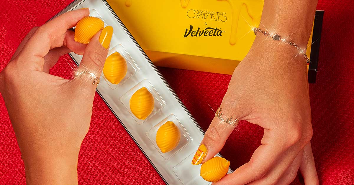 Gourmet fine chocolate brand Compartes teamed up with Velveeta to launch TruffVels, chocolate cheese truffles. The new offering is a Velveeta-infused white chocolate shell-shaped truffle designed to mirror Velveeta Shells and Cheese. TruffVels are now available on the Compartes website for $24.95 per box of five truffles.