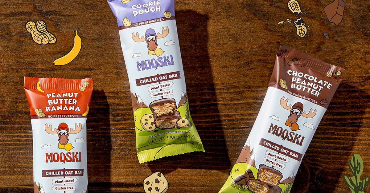 Founded in 2022, Mooski markets a line of muesli-inspired bars coated in dark chocolate and made with gluten-free oats, peanuts, almonds, olive oil and agave. Flavors include Chocolate Peanut Butter, Cookie Dough and Peanut Butter Banana.
