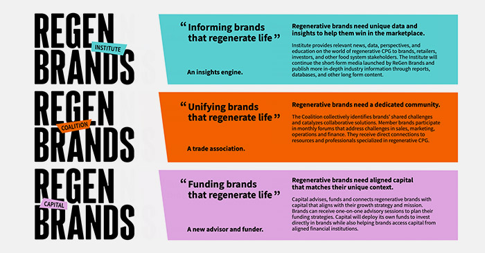 Launched in mid-October, the ecosystem consists of three arms: ReGen Brands Institute, the ReGen Brands Coalition and ReGen Brands Capital. Corsaro originally intended to launch just a regen ag-focused trade association, now known as the Coalition, but said it was clear that the space needed more than just community, but rather “clarity and coherence” around the commercial and financial needs necessary for the movement to succeed.