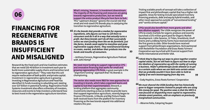 Indeed, regen-ag has been propped up and propelled into CPG by numerous actors spanning farmer-founded brands to upstart entrepreneurs to a handful of retailers and forward-thinking investors. There have also been efforts from large multinationals and mid-sized businesses to transition sections of their conventional or organic supply chains to regenerative practices.