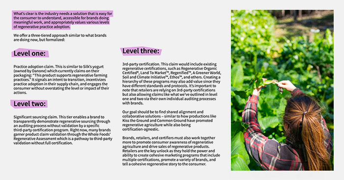 Efforts may include the potential creation of an interactive certification database to help brands compare and contrast which program best fits their needs. It will also work to generate additional research on consumer awareness around regenerative and hopes to make aggregated retail data on the growth of these brands easier to understand and access.
