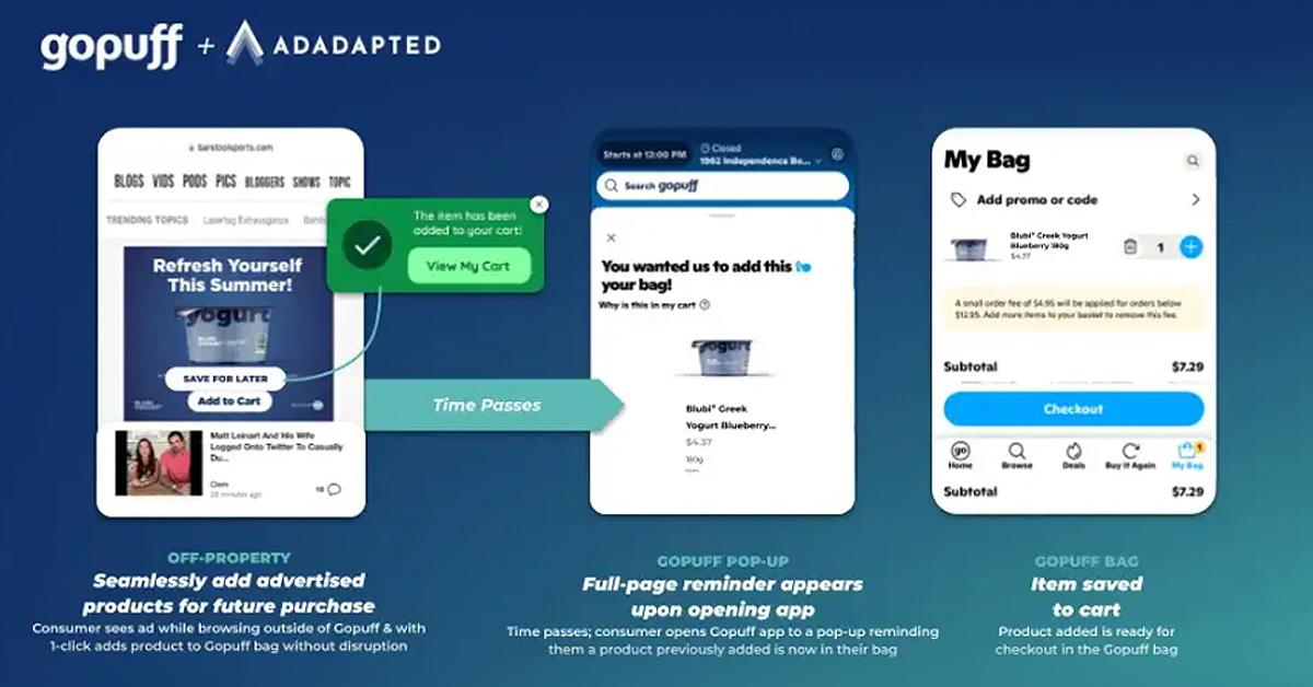 But perhaps most impactful is Gopuff’s move to be in more places – or everywhere, in the case of the internet. The company announced this week that it’s adopting AdAdapted’s Add-It carting technology, which allows for users to add branded items directly to their Gopuff cart simply by clicking an ad.