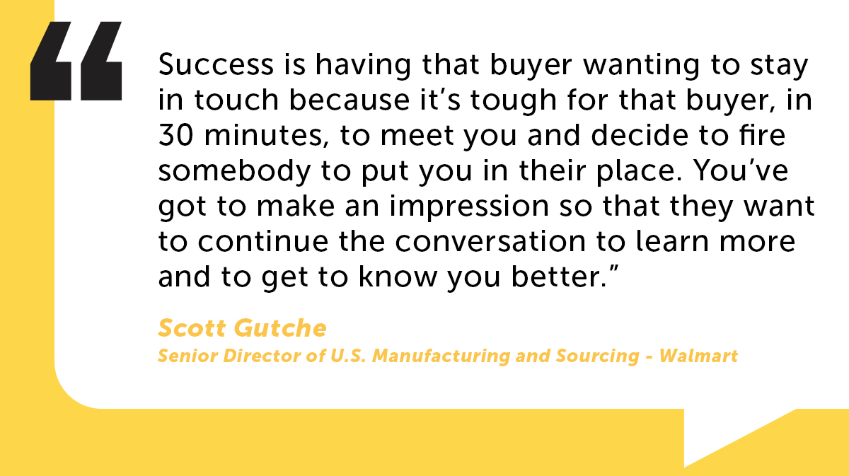 “Success is having that buyer wanting to stay in touch, because it’s tough for that buyer, in 30 minutes, to meet you and decide to fire somebody to put you in their place,” said Scott Gutche, senior director of U.S. manufacturing and sourcing at Walmart. “You’ve got to make an impression [so] that they want to continue the conversation to learn more and to get to know you better.”