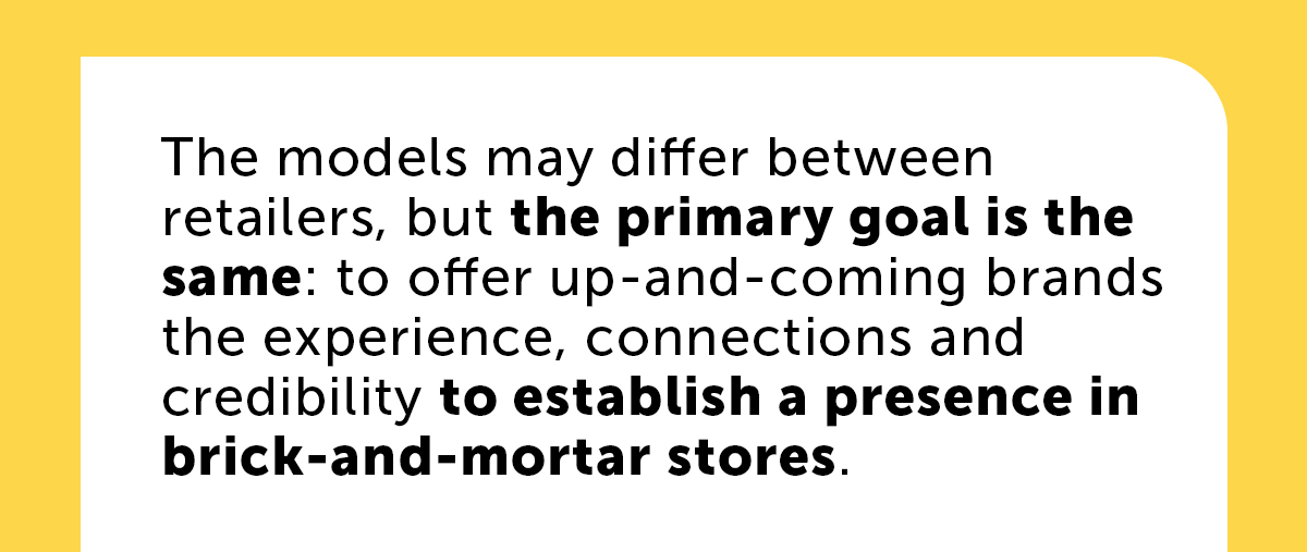 The models may differ between retailers, but the primary goal is the same: to offer up-and-coming brands the experience, connections and credibility to establish a presence in brick-and-mortar stores.
