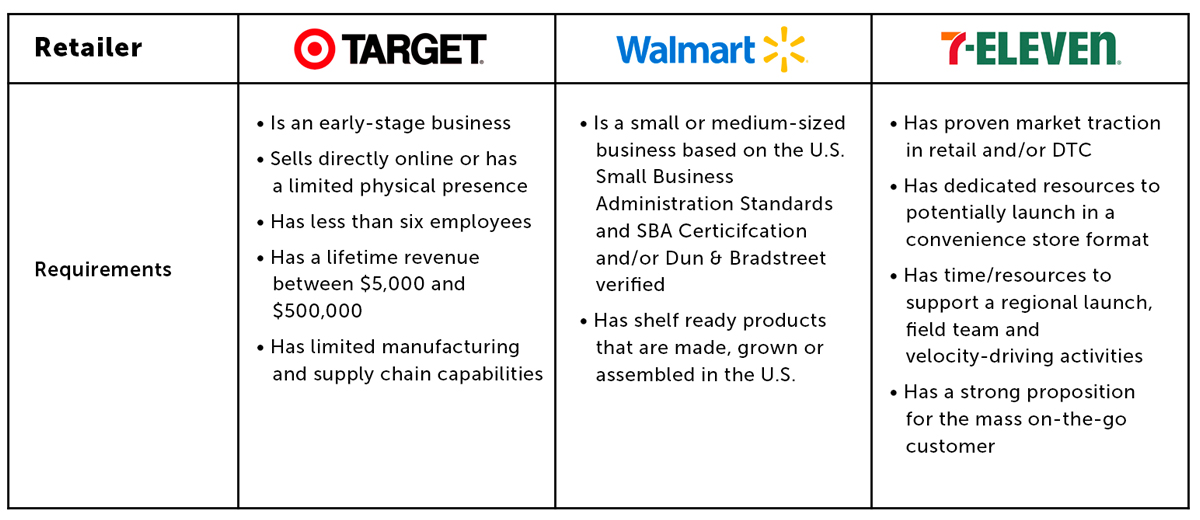 We spoke with several brands that went through retail sourcing programs at Target, Walmart and 7-Eleven about their experiences and how the events benefited or did not benefit their businesses. The overall consensus? Don’t go into a program expecting in-store placement at the completion of the accelerator, showcase or pitch event. Rather, embrace the opportunity itself and its side benefits like raising brand awareness and establishing longlasting relationships with buyers.
