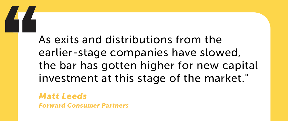 While “large strategics are feeling healthy [and] strong enough to play offense” on mergers and acquisitions, Leeds said, funding for early-stage brands remains challenged. The investor appetite for durable, profitable growth over “stratospheric, unprofitable growth” will likely continue for at least a few years “until the mistakes are far enough in the rearview that we begin the cycle anew.”