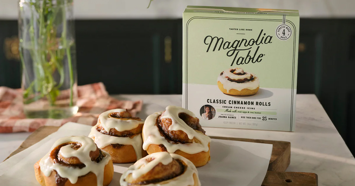 Magnolia Table is stepping beyond its restaurant roots and into the world of packaged food with a frozen baked goods collection exclusively available at Target. The 6-SKU lineup includes Jo’s Buttermilk Biscuits, Classic Cinnamon Rolls, After School Banana Bread, Chocolate Chip Cookies, Silo Cookies and Classic Sugar Cookies. The new offerings – crafted with familiar ingredients like eggs, butter, brown sugar and vanilla – have a SRP of $11.99 each. For more information, visit magnolia.com/pages/magnolia-table-products.