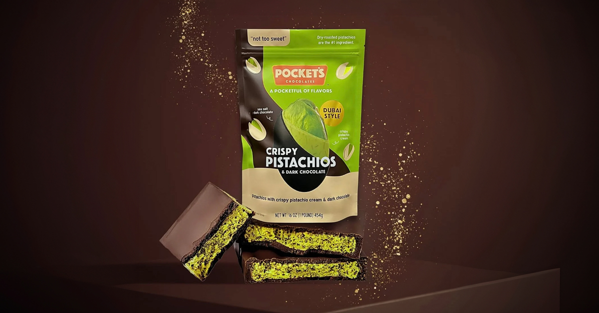 Marking its first expansion beyond almonds, Pocket’s Chocolates’ take on the Dubai chocolate craze combines pistachios coated with crispy pistachio cream and dark chocolate. The limited-edition item stands out as a well-timed, on-trend and incremental addition to the brand’s line of coated almonds in globally inspired flavors including Matcha, Mango Yuzu, Ube, Black Sesame and Vietnamese Coffee.