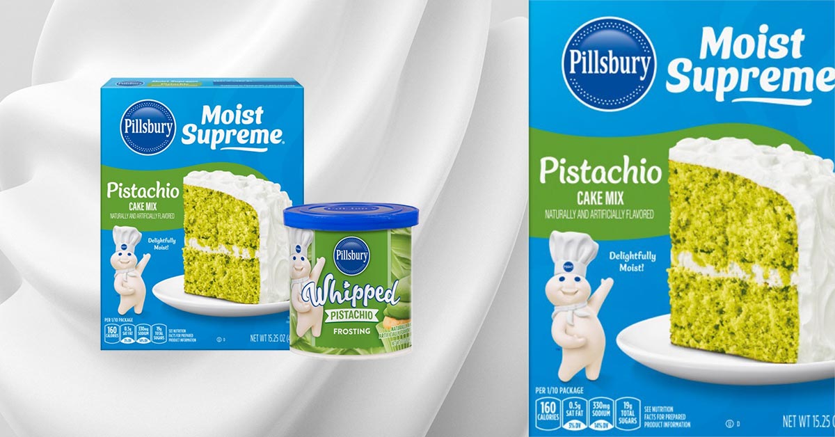 Pillsbury is introducing Moist Supreme Pistachio Cake Mix and Whipped Pistachio Frosting, available now at Walmart and H-E-B, with additional retailers like Kroger and AWG coming next month. More information is available at pillsburybaking.com.