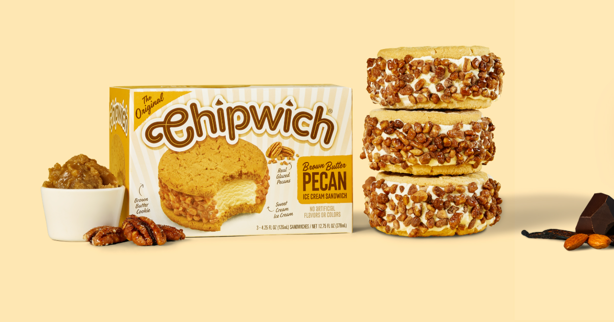 Ice cream cookie sandwich brand Chipwich has gone nuts, debuting two new flavors: Vanilla Chocolate Almond and Brown Butter Pecan. Both varieties feature premium nut pieces rolled around the outside of the frozen novelty, which is crafted with 12% butterfat ice cream. More information is available at chipwich.com.
